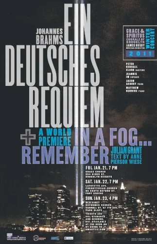 In a Fog - Remember was commissioned by the Grace and Spiritus Chorale of Brooklyn. It sets two poems by Anne Pierson Weise, combined into a single choral movement, and they allude, indirectly, to the calamitous events of 9/11 2001. The piece was commissioned for the 10th anniversary of that event, and performed at a special civic event in Brooklyn on September 11, 2011.